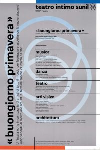 15.10.01 (1°Strato)Manifesto x 10Buongiorno Primavera, Teatro Intimo SunilGrafico: sconosciuto20-21.03.1987Evento musica, danza, teatro, arti visive, architetturaMagadino40,5 x 60 cm, colore grigio, logo azzurro