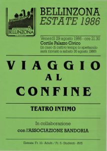 15.10.07.01Manifesto x 4Viaggio al Confine, Teatro IntimoGrafico: sconosciuto29.08.1986Bellinzona Estate 1986Cortile Palazzo Civico, Bellinzona43,5 x 62 cm, colore verde