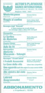 15.10.08.01Manifesto x 8Viaggio al Confine-Comuna Baires-Milano / Stagione 1986-1987, Teatro Intimo Sunil EnsembleGrafico: sconosciuto11-21.12.1986Manifesto Stagione Actor’s Playhouse Baires InternationalComuna Baires, Piazza Napoli, Milano32,5 x 68,5 cm, colore bianco azzurro