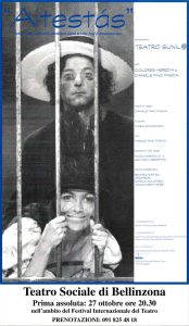 15.10.27 (5° Strato)Manifesto x 10Aitestás, Teatro Sunil, (con didascalia: Teatro Sociale di Bellinzona, martedí 27 ottobre ore 20.45 nell’ambito del Festival Internazionale del Teatro)Arianna Rossi27.10.1998Prima AssolutaDolores Heredia, Daniele Finzi PascaLugano40 x 69 cm, bianco, blu e grigioCon Dolores Heredia,Daniele Finzi Pasca / Testo e regia: Daniele Finzi Pasca / Musiche: Maria Bonzanigo / Luci: Marco Finzi Pasca / Assistente alla regia: Hugo Gargiulo, Antonio Vergamini / Hanno collaborato: Beatriz Sayad, Arkimede, Anna Maria Meier