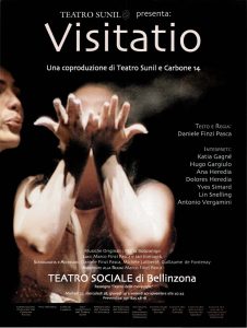 15.10.30Manifesto x 10Visitatio, Teatro Sociale di Bellinzona, Teatro Sunil e Carbon 14Daniele Finzi Pasca27-30.11.2001Rassegna del Teatro delle MeraviglieAna Heredia, Dolores HerediaOusine C, Montréal, Canada41,5 x 55 cm, quadricomia, ambiente marrone con fotoUna coproduzione Teatro Sunil e Carbon 14 / Testo e regia: Daniele Finzi Pasca /Interpreti: Katia Gagné, Hugo Gargiulo, Ana Heredia, Dolores Heredia, Yves Simard, Lin Snelling, Antonio Vergamini / Musiche originali: Maria Bonzanigo /Luci: Marco Finzi Pasca, Jan Komarek /scenografia e Accessori: Daniele Finzi Pasca, Michèle Laliberté, Guillaume de Fontenay /Assistente alla regia: Marco Finzi Pasca