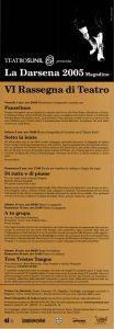 15.10.34Manifesto x 10La darsena 2005, Tres Tristes Tangos, Teatro SunilAndrea Lopez04-20.11.2005Vi Rassegna di Teatro,piedi di Antonio VergaminiMontréal, Ousine C21 x 60 cm, quadricromia, foto B/N, ambiente ambra