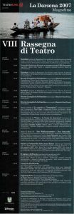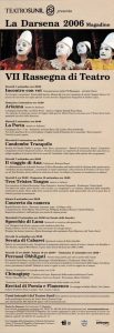 15.10.37Manifesto x 10La Darsena 2006, Arianna, Tres Tristes Tangos, Percossi Obbligati, Corsi-stage, Teatro SunilAndrea Lopez01-17.09.2006VII Rassegna di Teatro4 Clowns Cerimonia Chiusura Giochi Olimpici TorinoTorino Stadio21 x 60,4 cm, quadricromia, ambiente beige, foto coloriCorso intensivi: corso teorico ed uno pratico sulla metodologia di lavoro del Teatro Sunil
