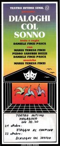 15.10.41Manifesto x 12Dialoghi col Sonno, (senza didascalie), Teatro SunilGrafica: Lucio Maria Morra1998Manifesto baseda dipinto Lucio Maria MorraMagadino34 x 82 cm, quadricromia,Testo e regia: Daniele Finzi Pasca /Con: Maria Teresa Finzi (Maria Bonzanigo), Pedro Sarubbi Ruzzi, Daniele Finzi Pasca /Musiche: Maria Teresa Finzi (Maria Bonzanigo)
