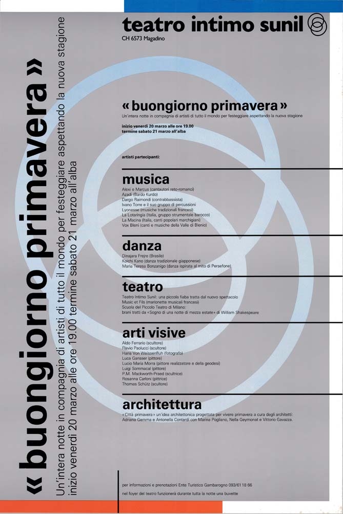 15.10.01 (1°Strato)Manifesto x 10Buongiorno Primavera, Teatro Intimo SunilGrafico: sconosciuto20-21.03.1987Evento musica, danza, teatro, arti visive, architetturaMagadino40,5 x 60 cm, colore grigio, logo azzurro