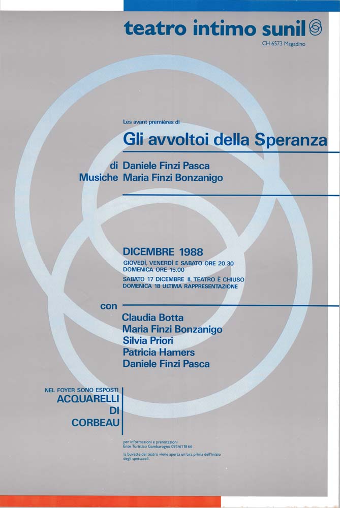 15.10.02Manifesto x 10Gli Avvoltoi della SperanzaGrafico: sconosciutoDicembre, 1988Repliche dicembre 1988, Teatro Intimo SunilMagadino40 x 60 cm, colore grigio, logo azzurro