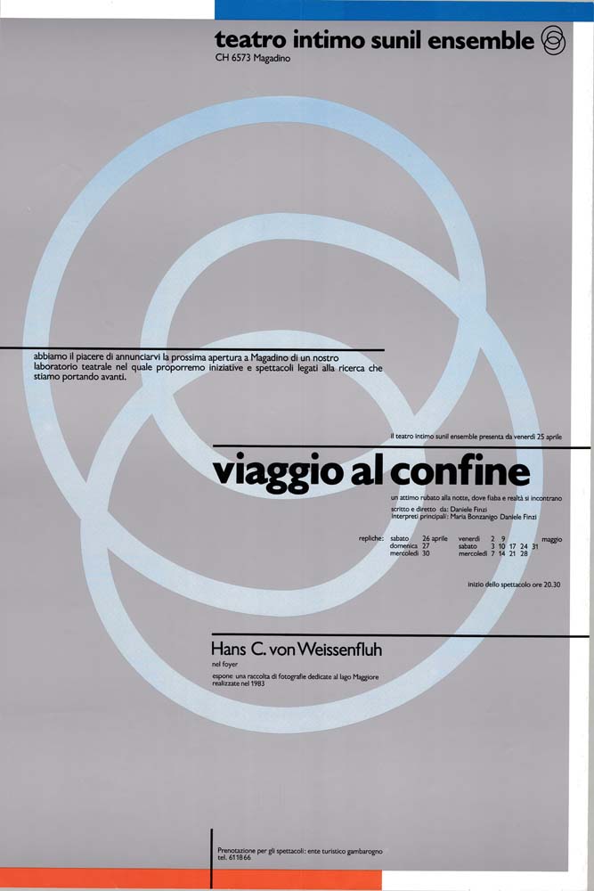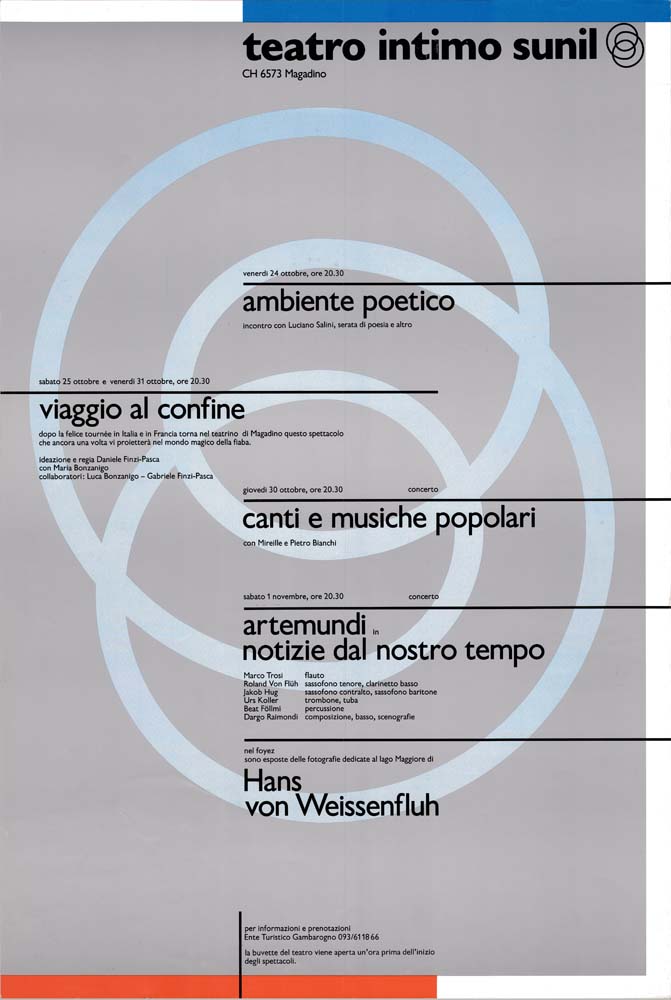 15.10.03.05 Manifesto x1Ambiente poetico, Viaggio al Confine, Canti e musiche popolari, Artemundi, Hans von Weissenfluh, Teatro Intimo SunilGrafico: sconosciuto25-31.10.1988Poesia, Teatro, Canti, Musiche, esposizione fotografica / Testo: Dopo la felice tournée in italia e Francia torna nel teatrino di Magadino questo spettacolo che ancora una volta vi proietterà nel mondo magico della fiabaMagadino40 x 60 cm, colore grigio, logo azzurro Poesia: Luciano Salini / Spettacolo: Ideazione e regia: Daniele Finzi-Pasca (Daniele Finzi Pasca), Maria Bonzanigo / collaboratori: Luca Bonzanigo, Gabriele Finzi-Pasca / Canti e musiche popolari: Mireille e Pietro Bainchi Artemundi: Dargo Raimondi / Fotografie: Hans von Weissenfluh