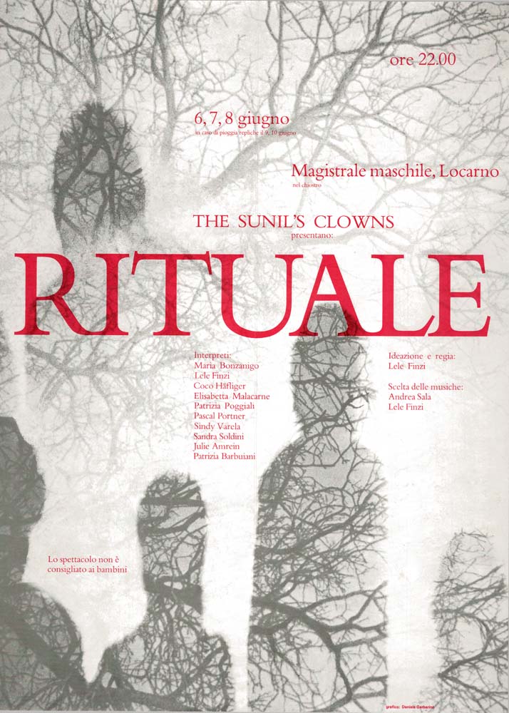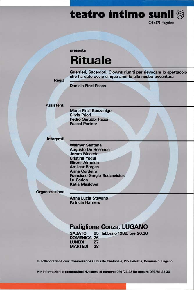 15.10.03.04Manifesto x1Rituale, Teatro Intimo SunilGrafico: sconosciuto25-28.02.1989Guerrieri, Sacerdoti, Clowns riuniti per rievocare lo spettacolo che ha dato avvio cinque anni fa alla nostra avventuraPadiglione Conza, Lugano40 x 60 cm, colore grigio, logo azzurro Regia: Daniele Finzi Pasca / Assistenti: Maria Finzi Bonzanigo (Maria Bonzanigo), Silvia Priori, Pedro Sarubbi Ruzzi, Pascal Portner / Interpreti: Walmyr Santana, Augusto De Resende, Joram Macedo, Cristina Yogui, Eliezer Almeida, Amilcar Borges, Anna Cordeiro, Francisco Sergio Bodzevicius, Lu Carion, Katia Maslowa / Organizzazione: Anna Lucia Stevano, Patricia Hamers