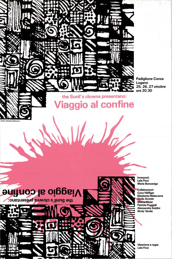 15.10.03.06Manifesto x2Viaggio al Confine, The Sunil’s ClownGrafica: Elisabetta Malacarne25-27.10.1985Padiglione Conza, Lugano B/N, macchie rosaInterpreti: Lele Finzi, Maria Bonzanigo / Collaboratori: Coco Häfliger, Elisabetta Malacarne, Giulie Amrein, Marco Meier, Patrizia Poggiali, Alessandra Soldini, Sindy Varela / Ideazione e regia: Lele Finzi (Daniele Finzi Pasca)
