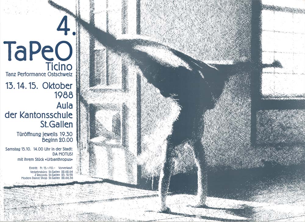 15.10.06.02Manifesto x 104.Tapeo-Ticino-Tanz Performance OstchweizDaniele Finzi Pasca13-15.10.1988Vetrina danza svizzeraMaria BonzanigoSan Gallo42 x 57,5 cm, colore bianco,grigio,blu