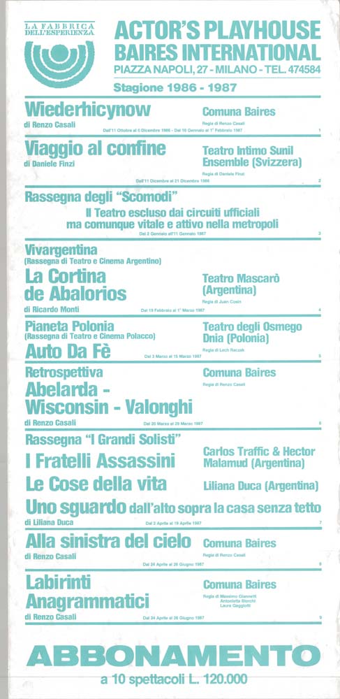 15.10.08.01Manifesto x 8Viaggio al Confine-Comuna Baires-Milano / Stagione 1986-1987, Teatro Intimo Sunil EnsembleGrafico: sconosciuto11-21.12.1986Manifesto Stagione Actor’s Playhouse Baires InternationalComuna Baires, Piazza Napoli, Milano32,5 x 68,5 cm, colore bianco azzurro