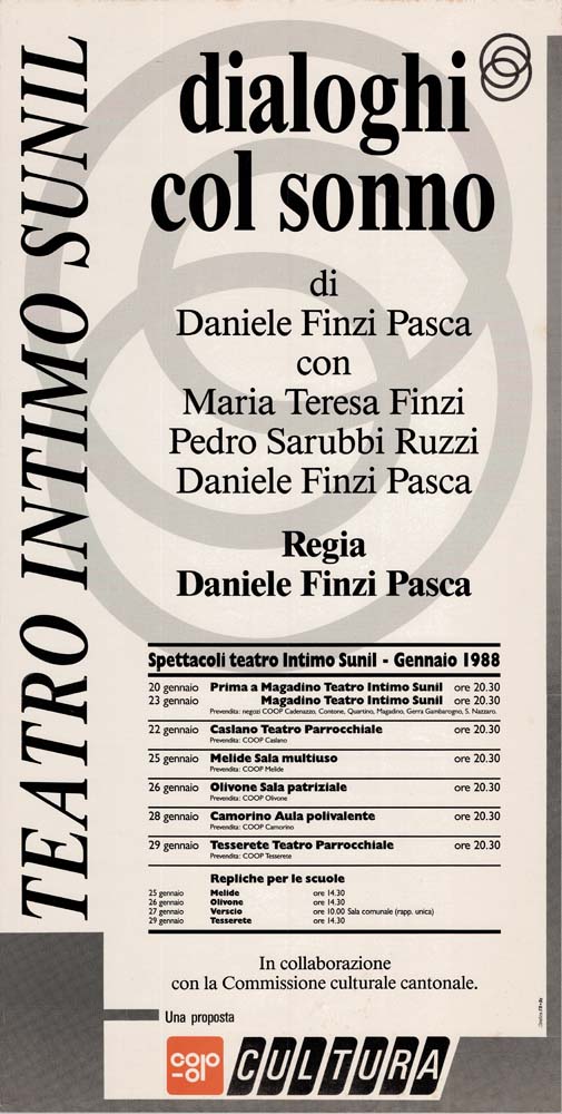 15.10.08.02Manifesto x 2Dialoghi col Sonno, Teatro Intimo Sunil, Tour Ticino, Coop CulturaGrafica: Fr e Bz20-29.01.1988Tour Ticino gennaio 1988: Magadino, Caslano, Melide, Olivone, Camorino, TessereteMgadino32 x 63,5 cm, colore bianco-panna, logo grigio, arancionedi: Daniele Finzi Pasca 7 con Maria Teresa Finzi (Maria Bonzanigo), Pedro Sarubbi Ruzzi, Daniele Finzi Pasca / Regia Daniele Finzi Pasca / una proposta Coop Cultura