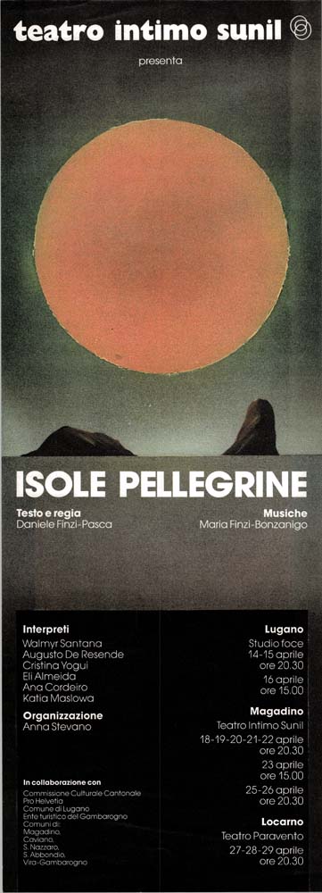 15.10.09Manifesto x 3Isole Pellegrine, Teatro Intimo SunilGrafico: sconosciuto14-29.04.1989Tour Lugano, Magadino, LocarnoMagadino22 x 62 cm, quadricromia, disegnoTesto e regia: Daniele Finzi Pasca / Musiche Maria Finzi Bonzanigo / Interpreti: Walmiyr Santana, augusto De Resende, Cristina Yogui, Eli Almeida, Ana Cordeiro,Katia Maslowa / Organizzazione: Anna Stevano