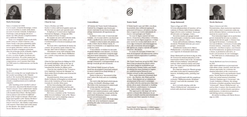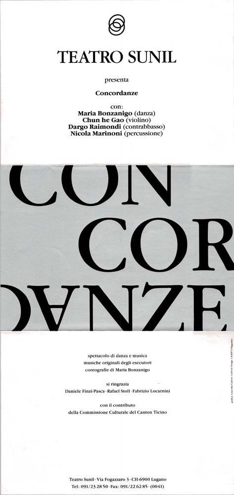 15.10.10Manifesto x 2 piegatiConcordanze, Teatro SunilGrafica: Giacomo Carloni1990Manifesto, presentazione spettacolo, Biografie di Maria Bonzanigo, Chun He Gao, Dargo Raimondi, Nicola marinoniMaria Bonzanigo, Chun He Gao, Dargo Raimondi, Nicola marinoniMagadino29,5 x 21 cm 29,5 x 62,5 cmTeatro Sunil, Con: Maria Bonzanigo (danza), Chun He Gao (Violino), Dargo Raimondi (Contrabbasso), Nicola Marinoni (percussione), ringraziamenti: Daniele Finzi Pasca, Rafael Stoll, Fabrizio Locarnini, con il contributo Commissione Culturale del Canton Ticino