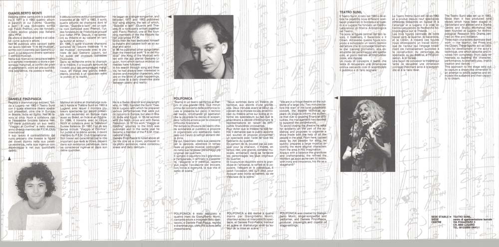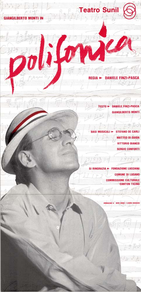 15.10.11Manifesto x 2 piegatiPolifonica, Teatro SunilImmagine Neri Dodo, Laura Ruggeri1990Retro manifesto: biografie Giangilberto Monti, Daniele Finzi PascaDaniele Finzi Pasca, Giangilberto MontiLugano24 x 17 cm, 24 x 50 cmRegia: Daniele Finzi Pasca / Testo Daniele Finzi Pasca, Giangilberto Monti / Basi Musicali:Stefano De Carli, Matteo Di Guida, Vittorio Confronti / Si ringrazia Fondazione Lucchini, Comune di Lugano, Commissione Culturale Canton Ticino
