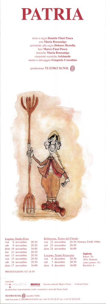15.10.16Manifesto x 1Patria, Teatro SunilGrafico: sconosciuto08-24.11.1996 06-08.12.1996Tournée Ticino, Studio Foce Lugano, Teatro Paravento Locarno, teatro del Chiodo BellinzonaDisegno Maria BonzanigoMagadino
