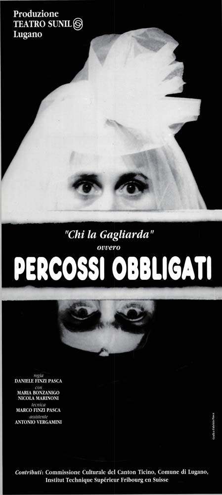 15.10.17 (4° Strato)Manifesto x 10“Chi la Gagliarda” ovvero Percossi Obbligati, Teatro SunilGrafica: Fabrizia Pasca, Fotografo: Arianna Rossi1994Manifesto base, senza didascalieMaria Bonzanigo, Nicola MarinoniLugano31 x 69 cm, B/NRegia Daniele Finzi Pasca / Con MAria Bonzanigo, Nicola Marinoni / Tecnica: Marco Finzi Pasca / Assistente: Antonio Vergamini