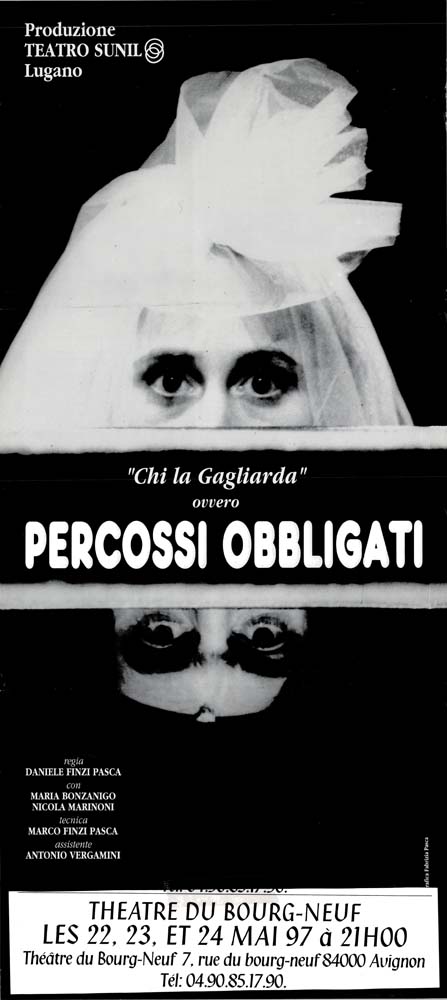 15.10.18Manifesto x 1“Chi la Gagliarda” ovvero Percossi Obbligati, Teatro SunilGrafica: Fabrizia Pasca, Fotografo: Arianna Rossi22-24.05.1997Con date Theatre Du Bourg-Neuf, Avignone, FranciaMaria Bonzanigo, Nicola MarinoniLugano31 x 69 cm, B/NRegia Daniele Finzi Pasca / Con MAria Bonzanigo, Nicola Marinoni / Tecnica: Marco Finzi Pasca / Assistente: Antonio Vergamini