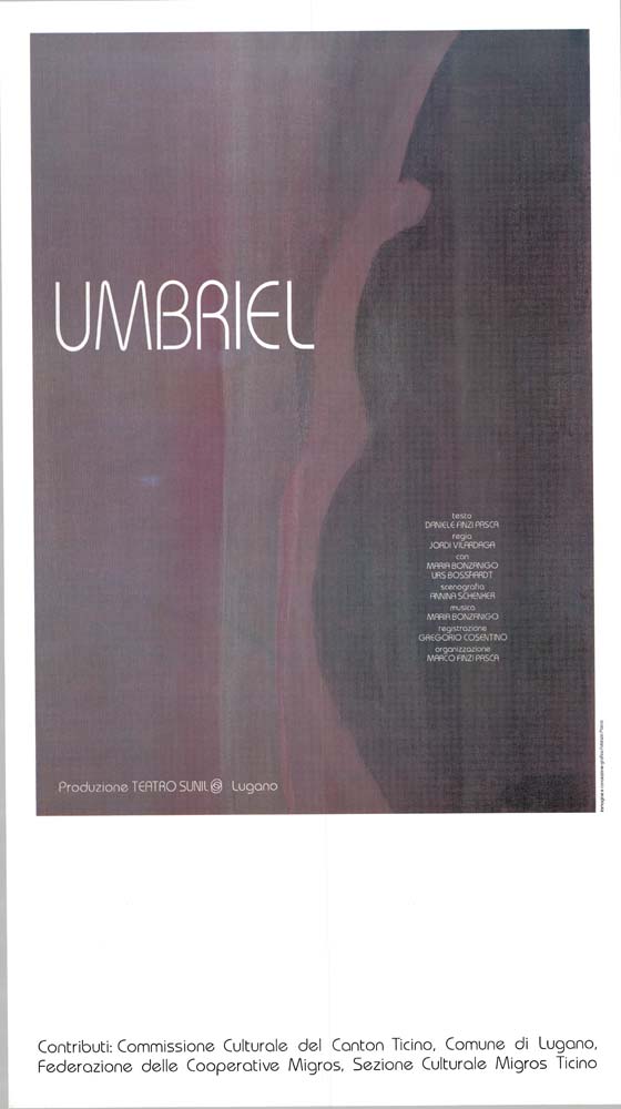 15.10.21Manifesto x 10Umbriel, Teatro SunilImmagine e concezione grafica: Fabrizia Pasca1993Lugano39,5 x 70 cm, colori pastello tendenti al violaTesto: Daniele Finzi Pasca / Regia: Jordi Vilardaga / Con Maria Bonzanigo, Urs Bossharardt / Scenografia: Annina Schenker / Musica: Maria Bonzanigo / Registrazione: Gregorio Cosentino / Organizzazione: Marco Finzi Pasca