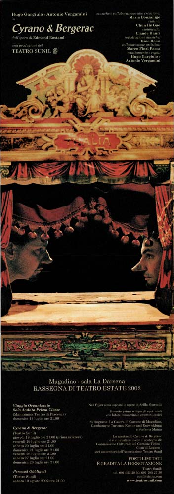 15.10.22Manifesto x 10Cyrano & Bergerac, Teatro SunilGrafico: sconosciuto18-28.07.2002Rassegna di teatro Estate 2002, La Darsena, Percossi ObbligatiAntonio Vergamini, Hugo GargiuloMagadino21 x 60 cm, nero, oroCon Hugo Gargiulo, Antonio Vergamini / Musiche e collaborazione alla creazione: Maria Bonzanigo, Violino: Chun He Gao, Violoncello: Claude Hauri / Registrazione musiche: Rino Rossi / Collaborazione artistica: Marco Finzi Pasca / Adattamento e Regia: Hugo Gargiulo, Antonio Vergamini