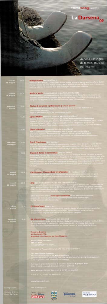 15.10.24Manifesto x 7La darsena 2009, Ana documentario, Teatro SunilGrafico: sconosciuto15-24.05.2009X Rassegna di Teatro, Musica ed Incontriscarpe ClownMagadino21 x 59 cm, Quadricomia con foto, colore fondo beigeDocumentario Ana, di Antonio Vergamini
