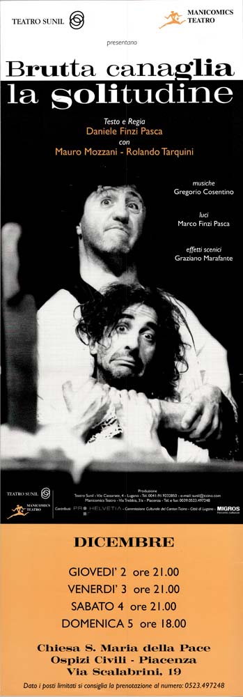 15.10.25Manifesto x 1Brutta Canaglia la Solitudine, Teatro Sunil, Manicomics TeatroGrafico: sconosciuto02-05.12.1999Date PiacenzaMauro Mozzani, Rolando TarquiniChiesa S.Maria della Pace, Ospizi Civili, Piacenza21 x 60 cm, quadricomia, arancione, foto in B/Ntesto e regia: Daniele Finzi Pasca, Con: Mauro Mozzani, Rolando Tarquini, Musiche: Gregorio Cosentino, Luci: Marco Finzi Pasca, Effetti scenici: Graziano Marafante