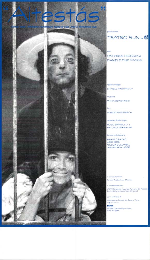 15.10.27 (5° Strato)Manifesto x 10Aitestás, Teatro Sunil, (con didascalia: Teatro Sociale di Bellinzona, martedí 27 ottobre ore 20.45 nell’ambito del Festival Internazionale del Teatro)Arianna Rossi27.10.1998Prima AssolutaDolores Heredia, Daniele Finzi PascaLugano40 x 69 cm, bianco, blu e grigioCon Dolores Heredia,Daniele Finzi Pasca / Testo e regia: Daniele Finzi Pasca / Musiche: Maria Bonzanigo / Luci: Marco Finzi Pasca / Assistente alla regia: Hugo Gargiulo, Antonio Vergamini / Hanno collaborato: Beatriz Sayad, Arkimede, Anna Maria Meier