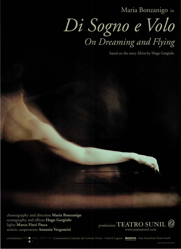 15.10.29Manifesto x 10Di Sogno e Volo (On Dreaming and Flying), Teatro SunilFausto Gerevini2000manifesto con foto braccio MariaMaria Bonzanigo (braccio)Magadino40 x 45 cm, quadricomia, ambiente marrone, foto braccioBased on the Story Elvira by Hugo Gargiulo 7 horeography and direction: Maria Bonzanigo 7 Scenography and effects: Hugo Gargiulo 7 Lights: Marco Finzi Pasca 7 Artistic cooperation: Antonio Vergamini