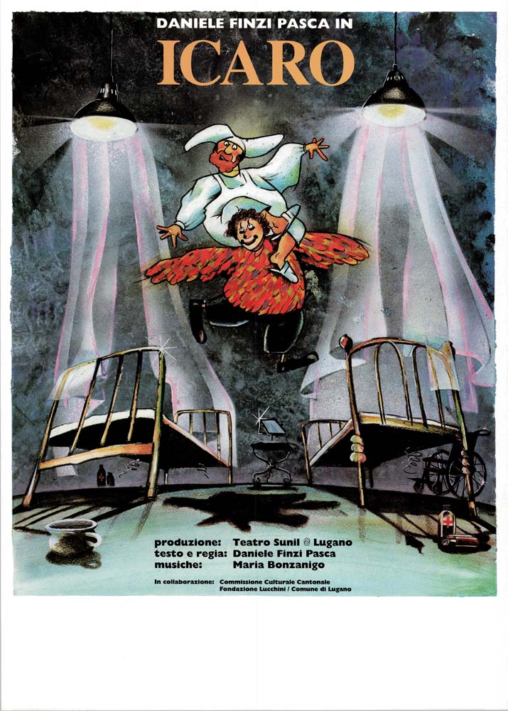 15.10.31 (6° Strato)Manifesto x 10Icaro, Teatro SunilGrafica: Marco Meier1991Primo manifesto di IcaroDisegno caricatura su Daniele Finzi PascaLugano50 x 70 cm, quadricromia, pittura di Marco MeierTesto e regia: Daniele Finzi Pasca /Musiche: Maria Bonzanigo
