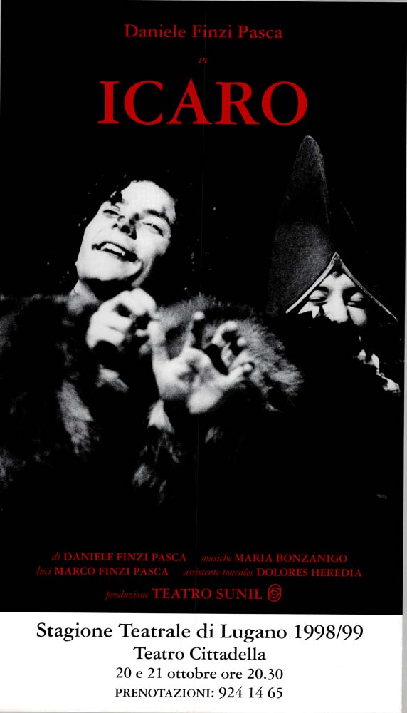 15.10.32Manifesto x 10Icaro, Teatro Sunil, (con didascalia: Stagione Teatrale di Lugano 1998/99-Teatro Cittadella)Fausto Gerevini20-21.10.1998Manifesto con foto Daniele Finzi Pasca con uno spettatoreLugano40 x 69,5 cm, quadricromia, foto B/N, rosso, didascaliaDi: Daniele Finzi Pasca / Musiche: Maria Bonzanigo / Luci: Marco Finzi Pasca / Assistente tournées: Dolores Heredia
