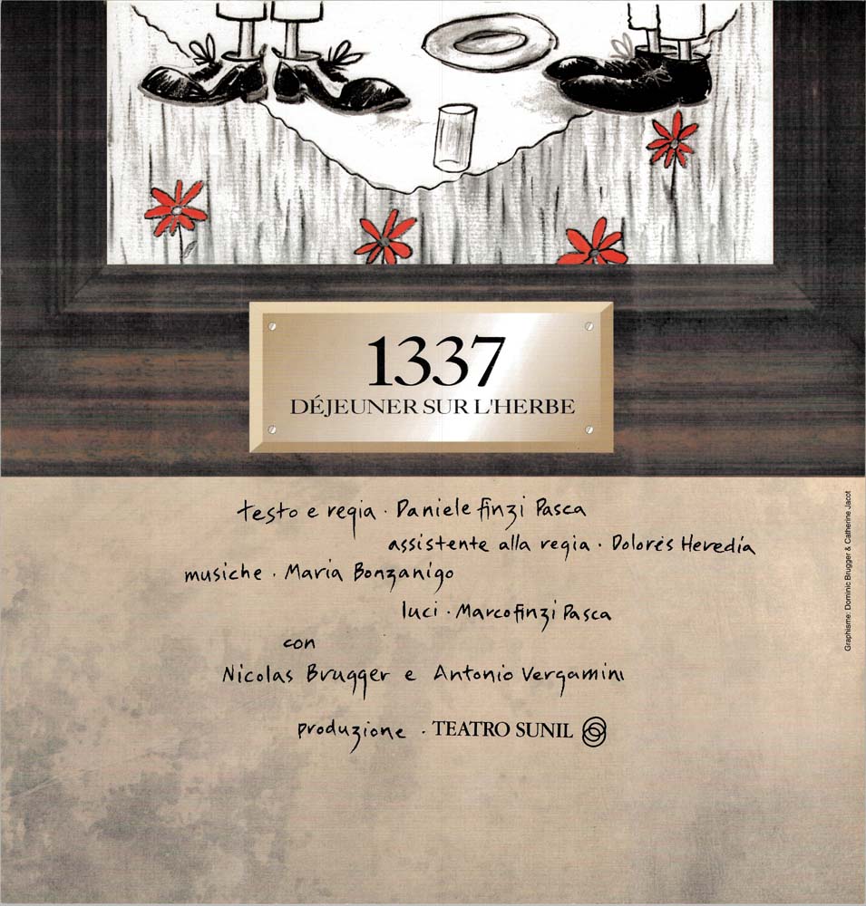 15.10.33Manifesto x 101337 Déjeuner Sur l’Herbe, Teatro SunilGrafica: Dominic Brugger & Catherine Jacot1995manifesto base, versione italianaDisegnoLugano40 x 42 cm, quadricromia, ambiente marroneTesto e regia: Daniele Finzi Pasca / Assistente alla regia: Dolores Heredia /Musiche: Maria Bonzanigo /Luci: Marco Finzi Pasca /on: Nicolas Brugger, Antonio Vergamini
