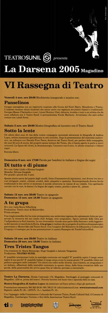 15.10.34Manifesto x 10La darsena 2005, Tres Tristes Tangos, Teatro SunilAndrea Lopez04-20.11.2005Vi Rassegna di Teatro,piedi di Antonio VergaminiMontréal, Ousine C21 x 60 cm, quadricromia, foto B/N, ambiente ambra