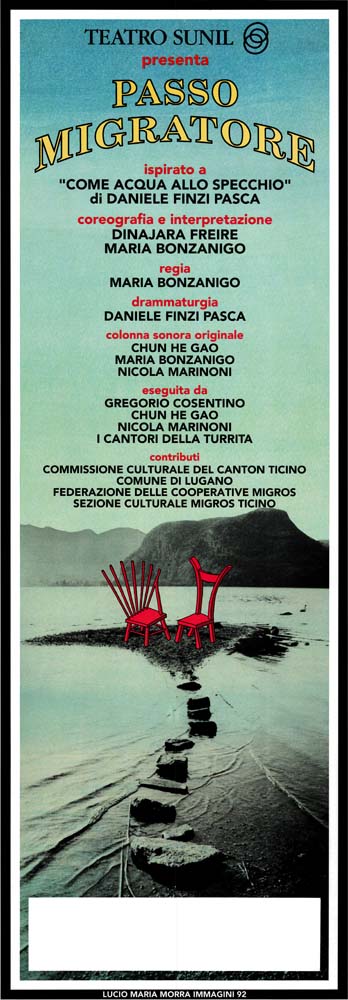 15.10.35 (7° Strato)Manifesto x 10Passo Migratore, Teatro SunilGrafica: Lucio Maria Morra immagini 921992Manifesto baseda dipinto Lucio Maria MorraMagadino34 x 98 cm, quadricromia,Ispirato a “Come acqua allo specchio” di Daniele Finzi Pasca /Coreografia e interpretazione: Dinajara Freire, Maria Bonzanigo /Regia: Maria Bonzanigo /Drammaturgia: Daniele Finzi Pasca /Colonna sonora originale: Chun He Gao, Maria Bonzanigo, Nicola Marinoni /Eseguito da: Gregorio Cosentino, Chun He Gao, Nicola Marinoni, I Cantori della Turrita