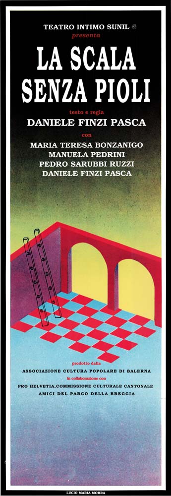 15.10.36Manifesto x 10La Scala Senza PioliGrafica: Lucio Maria Morra1987Manifesto baseda dipinto Lucio Maria MorraMagadino34 x 99 cm, quadricromiaTesto e regia: Daniele Finzi Pasca /Con: Maria Teresa Bonzanigo, Manuela Pedrini, Pedro Sarubbi Ruzzi, Daniele Finzi Pasca