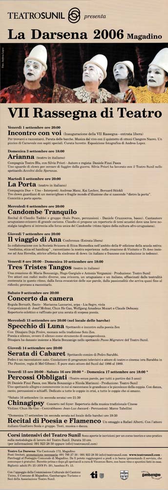 15.10.37Manifesto x 10La Darsena 2006, Arianna, Tres Tristes Tangos, Percossi Obbligati, Corsi-stage, Teatro SunilAndrea Lopez01-17.09.2006VII Rassegna di Teatro4 Clowns Cerimonia Chiusura Giochi Olimpici TorinoTorino Stadio21 x 60,4 cm, quadricromia, ambiente beige, foto coloriCorso intensivi: corso teorico ed uno pratico sulla metodologia di lavoro del Teatro Sunil
