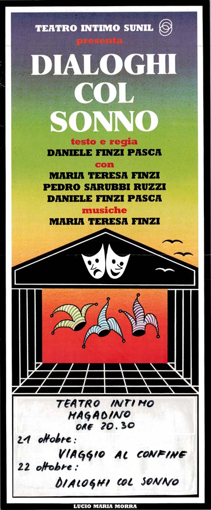 15.10.40 (8° Strato)Manifesto x 12Dialoghi col Sonno (con didascalie: Magadino ore 20.30, venerdi 21 ottobre Viaggio al confine, sabato 22 ottobre Dialoghi col Sonno), Teatro SunilGrafica: Lucio Maria Morra1998Date Magadinoda dipinto Lucio Maria MorraMagadino34 x 82 cm, quadricromia,Testo e regia: Daniele Finzi Pasca /con: Maria Teresa Finzi (Maria Bonzanigo), Pedro Sarubbi Ruzzi, Daniele Finzi Pasca /Musiche: Maria Teresa Finzi (Maria Bonzanigo)