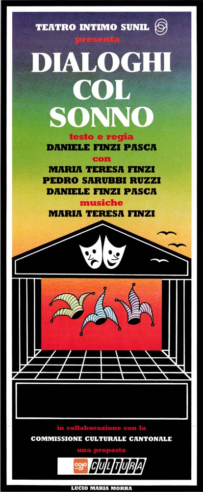 15.10.41Manifesto x 12Dialoghi col Sonno, (senza didascalie), Teatro SunilGrafica: Lucio Maria Morra1998Manifesto baseda dipinto Lucio Maria MorraMagadino34 x 82 cm, quadricromia,Testo e regia: Daniele Finzi Pasca /Con: Maria Teresa Finzi (Maria Bonzanigo), Pedro Sarubbi Ruzzi, Daniele Finzi Pasca /Musiche: Maria Teresa Finzi (Maria Bonzanigo)