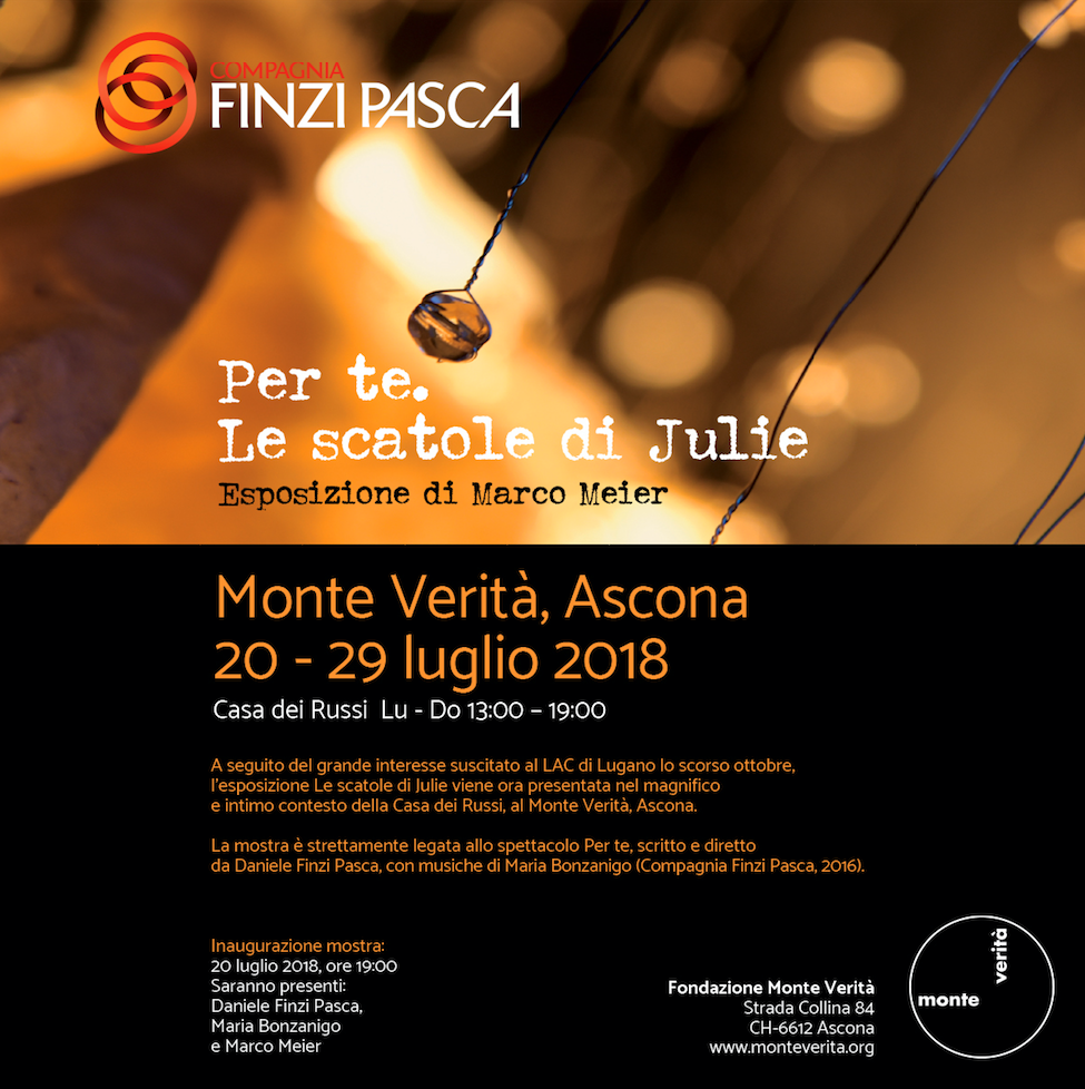 A seguito del grande interesse suscitato al LAC (Lugano Arte e Cultura) lo scorso ottobre, l’esposizione di Marco Meier viene ora presentata nel magnifico e intimo contesto della Casa dei Russi, al Monte Verità, Ascona. La mostra è strettamente legata allo spettacolo Per te, scritto e diretto da Daniele Finzi Pasca.